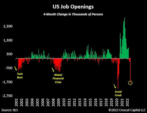팬데믹을 제외하고 가장 큰 폭의 채용감소가 나타났다(출처 : BLS)