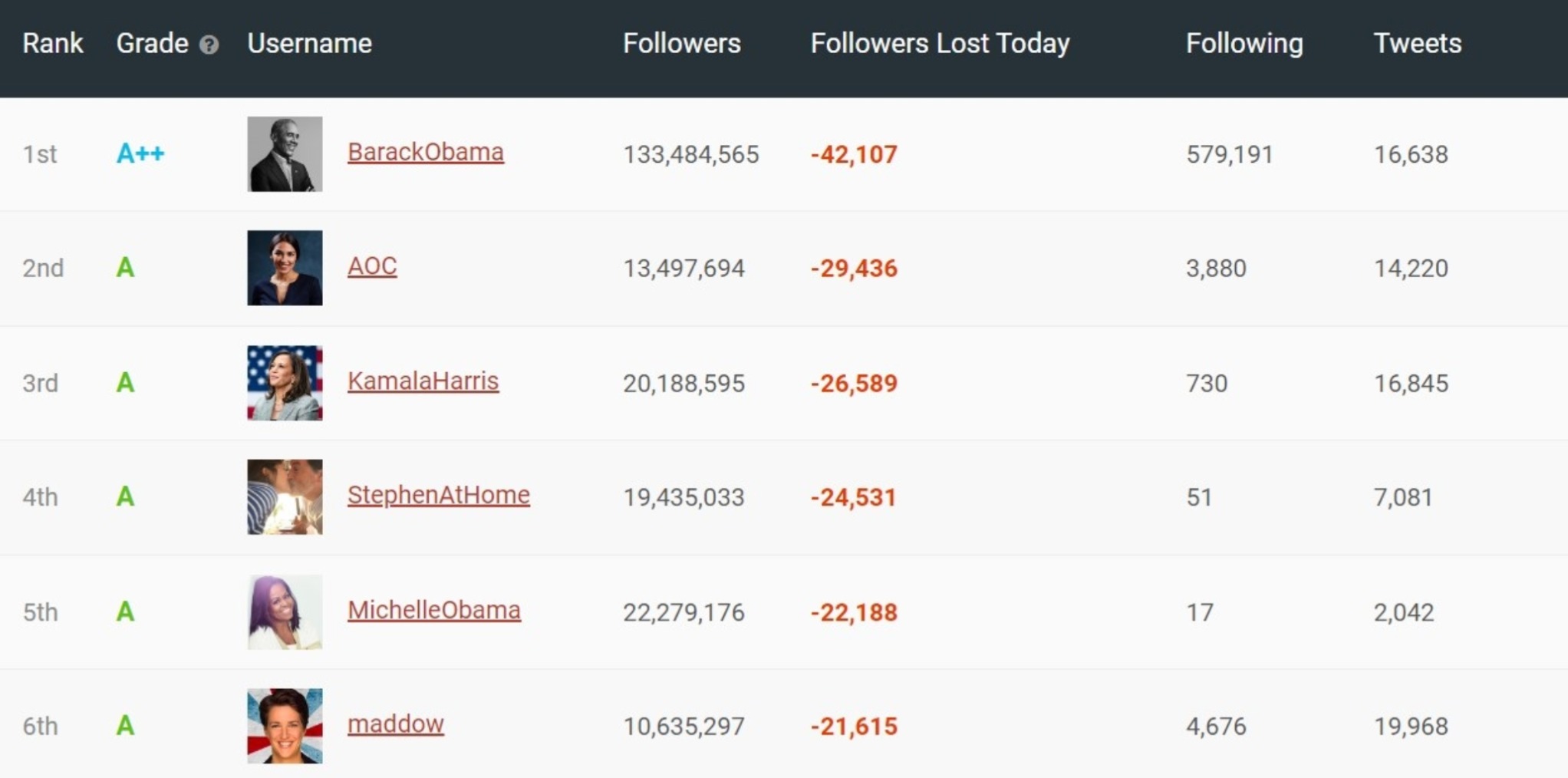진보성향 유명인 트위터 팔로워 감소 (출처 : 소셜 블레이드)