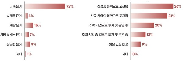 AI 활용에 대한 질문에서는 아직 기획 단계에 머물러있다는 답변이 72%로 가장 많았다. 신성장 동력으로 고려한다는 응답이 36%, 신규 사업의 일환으로 고려하고 있다는 답변이 31%를 차지했다.