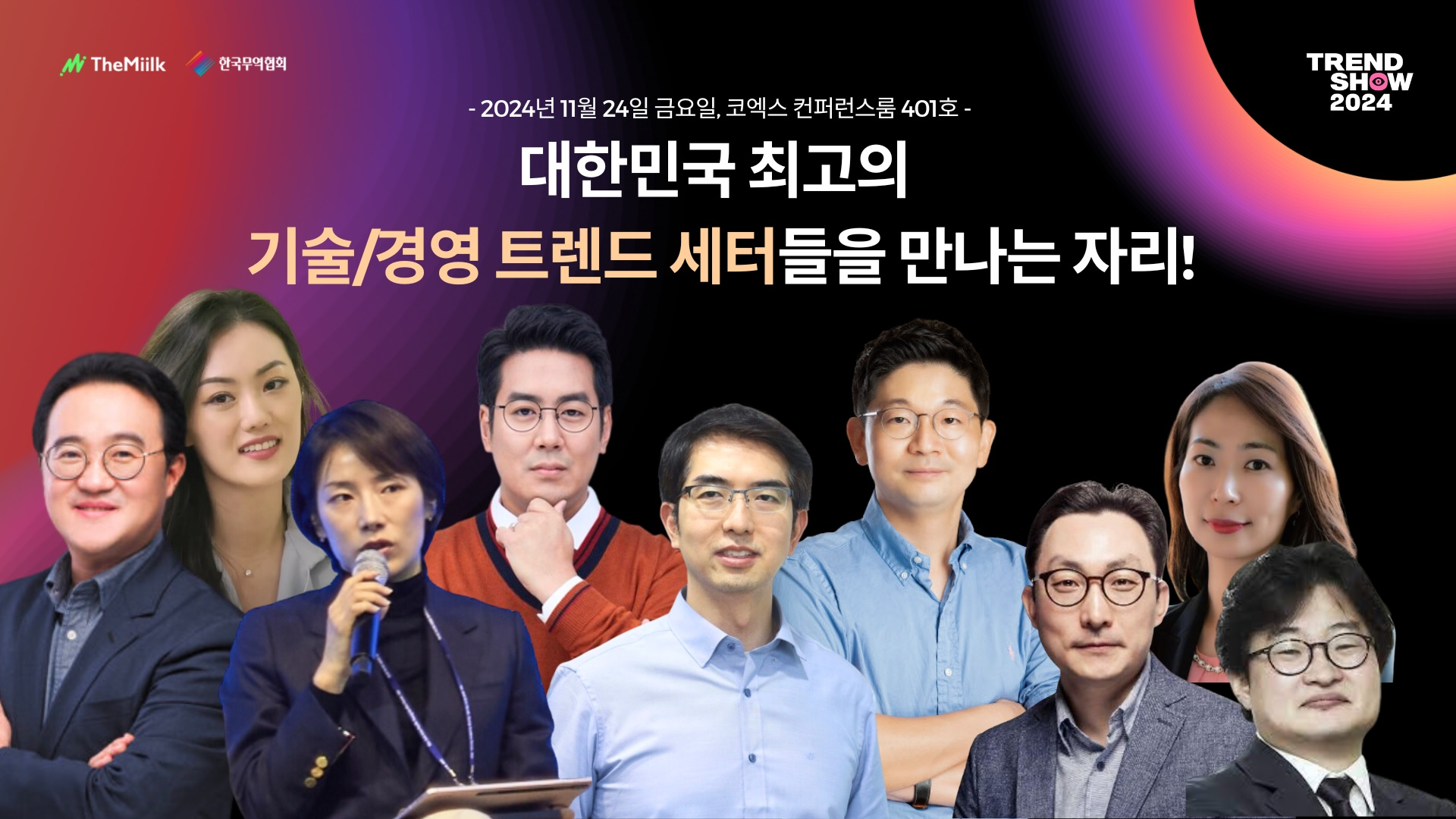더밀크는 한국무역협회(KITA)와 공동으로 내달 24일 코엑스 컨퍼런스룸(401호)에서 '트렌드쇼2024'를 개최합니다. 트렌드쇼2024는 매년 각 영역에서 적용할 수 있는 기술, 경영 트렌드를 한눈에 알 수 있게 하는 자리입니다.